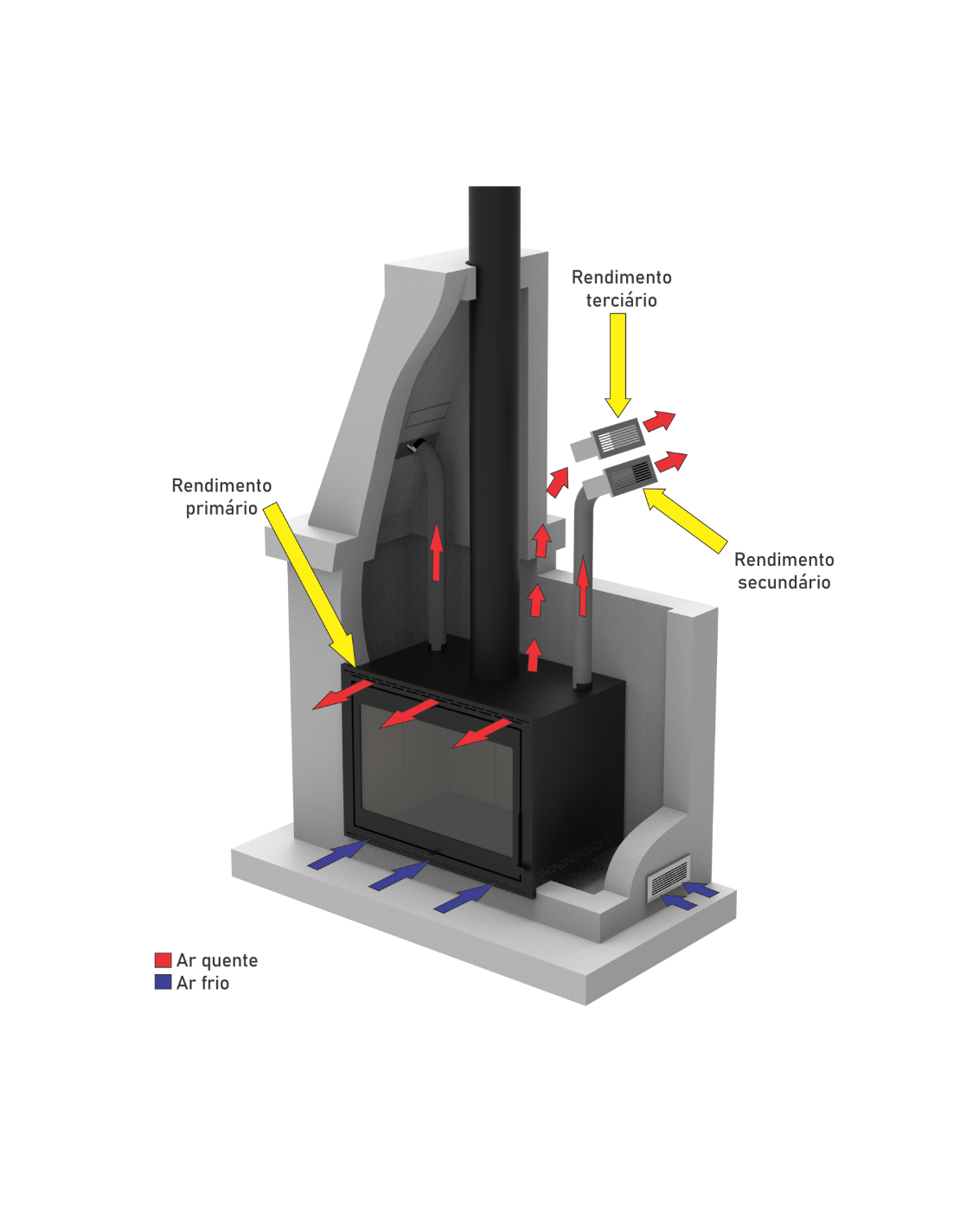 Quando o ar circula de forma inteligente, temos: (1) rendimento primário, quando o ar quente sai pela frente da lareira impulsionado por um ou dois ventiladores; (2) rendimento secundário, quando o ar quente sai do corpo da lareira através de dutos até sair por uma grelha; e (3) rendimento terciário, quando o ar quente que fica preso dentro da estrutura de gesso e/ou pedra sai por uma grelha superior. O resultado é simples. MAIS CALOR, MAIS EFICIÊNCIA e MAIS ACONCHEGO.